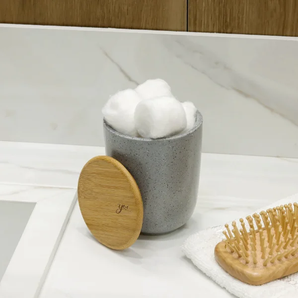 O Porta Algodão Osaka Reativo Cinza YOI, possui tampa em bambu que combina com seu material de cerâmica com um acabamento impecável trás mais sofisticação para o seu banheiro!